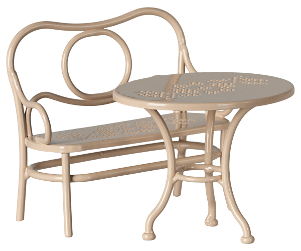 Ett cafésats i möbelstil som passar perfekt för musföräldrarna ? Mamma och Pappa Mus. Setet består av en bänk och ett bord ? en mysig plats för att njuta av eftermiddagsteet tillsammans. Oerhört detaljrik produkt som är helt handgjord av det populära företaget Maileg.
