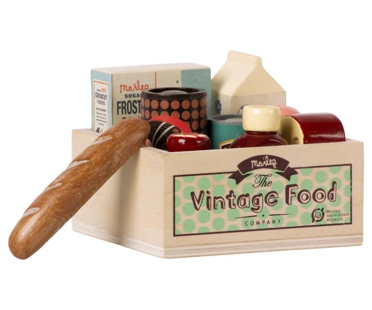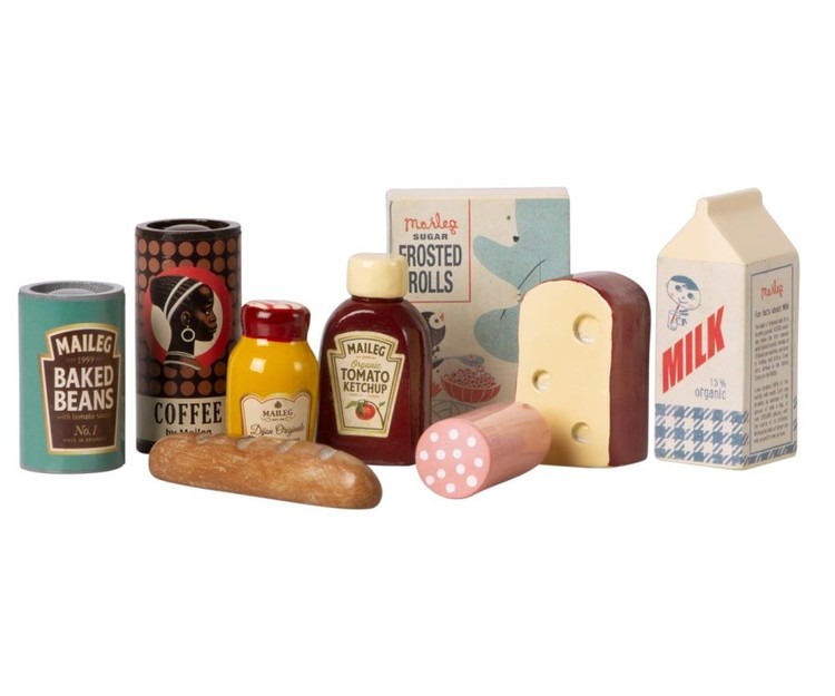 Man måste ju ha lite mat inne i dockhuset, inte sant? Med detta underbara frukostset går ingen hungrig på morgonen. Oerhört detaljrik produkt som är helt handgjord av det populära företaget MailegLådan innehåller: flingor, sylt, salami, ketchup, mjölk, kaffe, bönor, baguett och ost.Ålder: Från 3 år.Material: Polyresin, träDesigner: Maileg