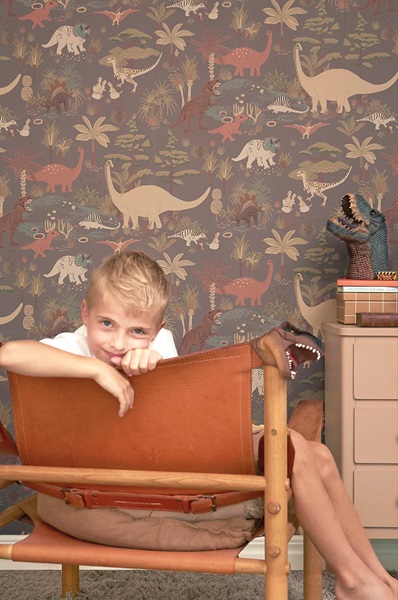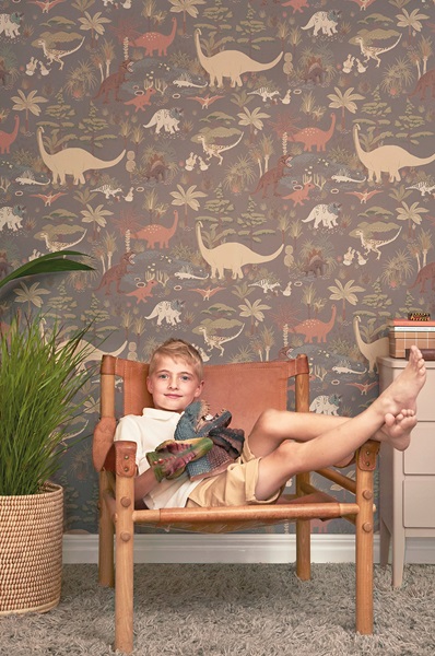 Majvillan, tapet till barnrummet Dinosaur vibes, evening grey