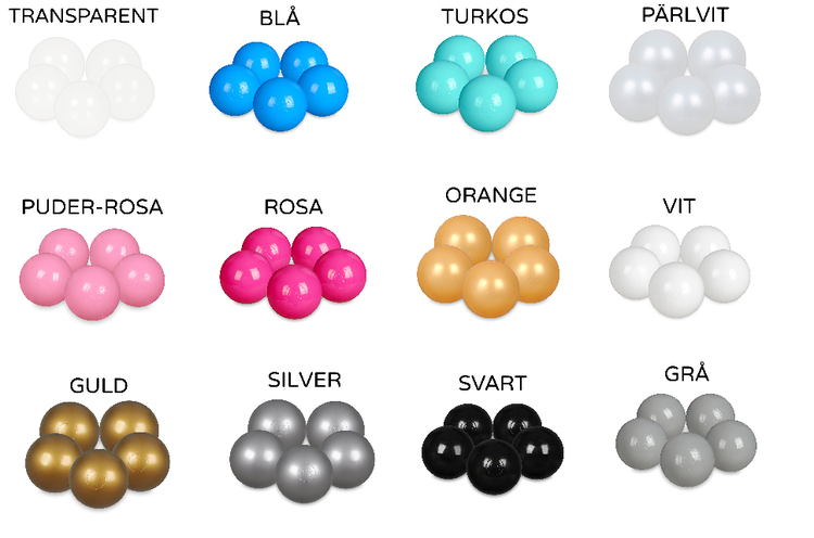 Det finns otaliga färger av bollar, du väljer själv färger på bollarna. Ange vid beställning vilka färger du vill ha.