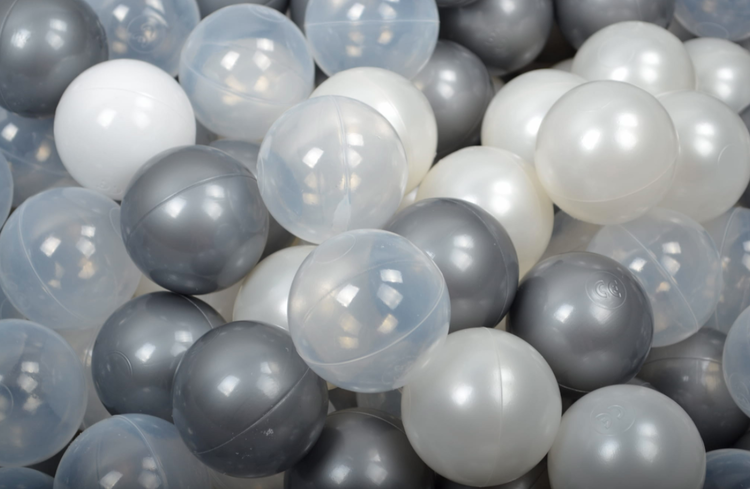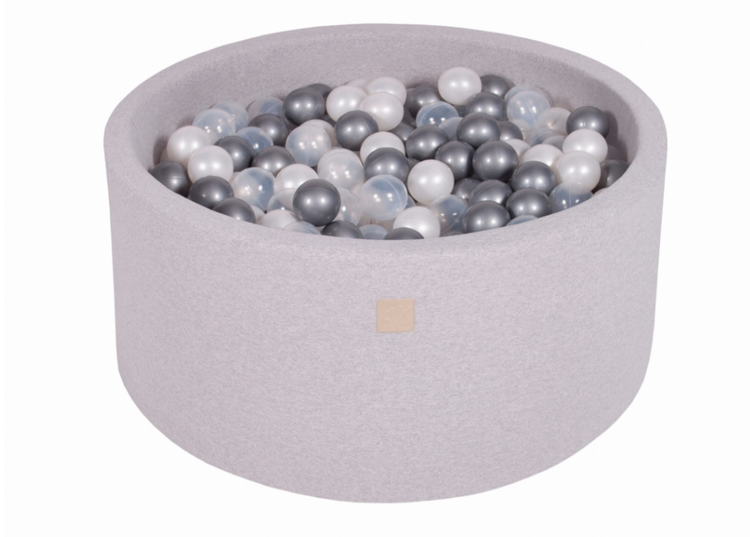 Meow, ljusgrå bollhav 90×40 med 300 bollar (silver, pearl, transparent)