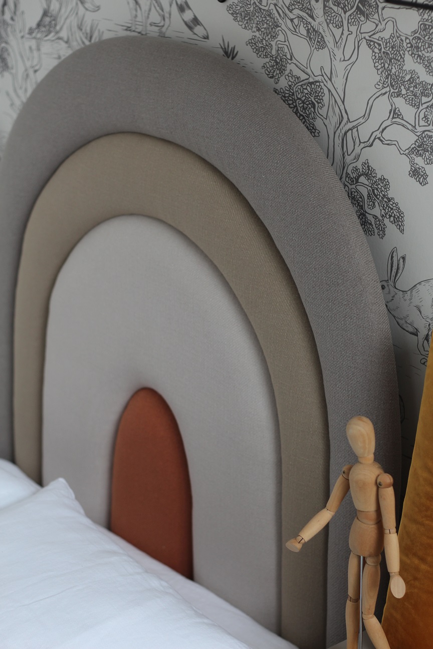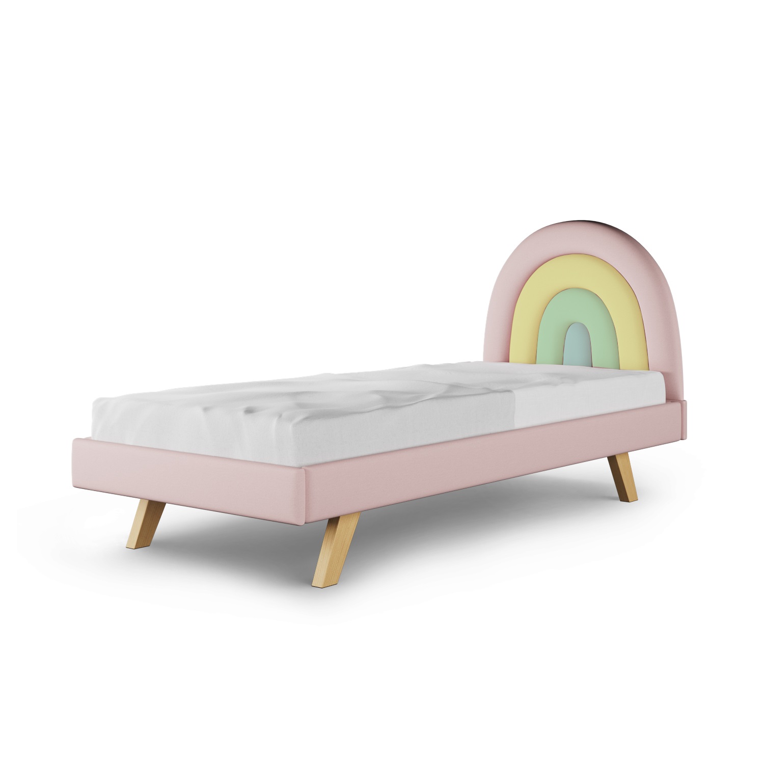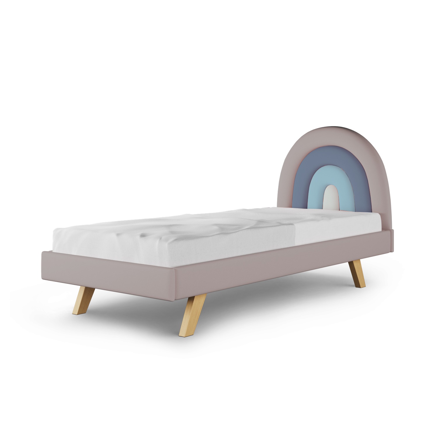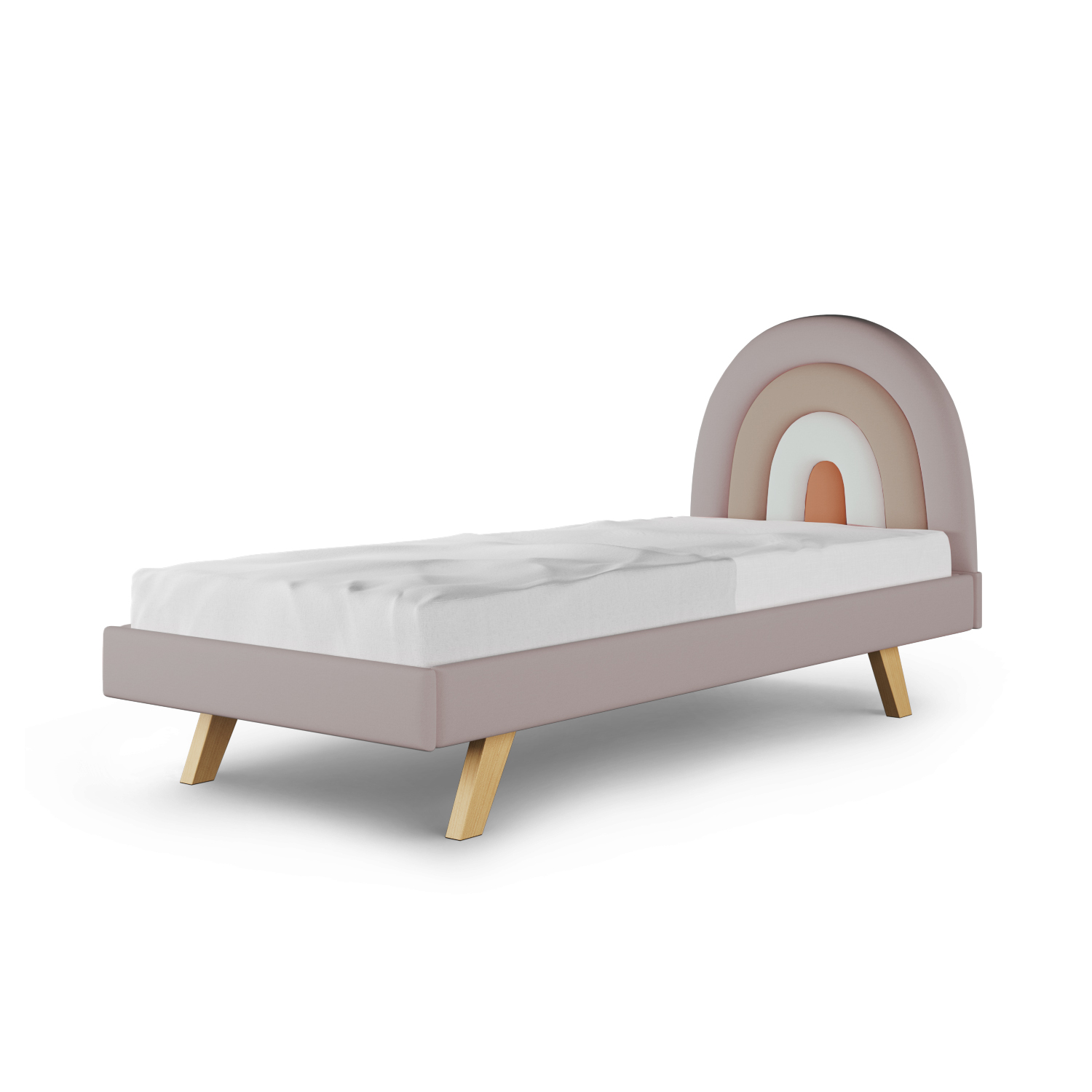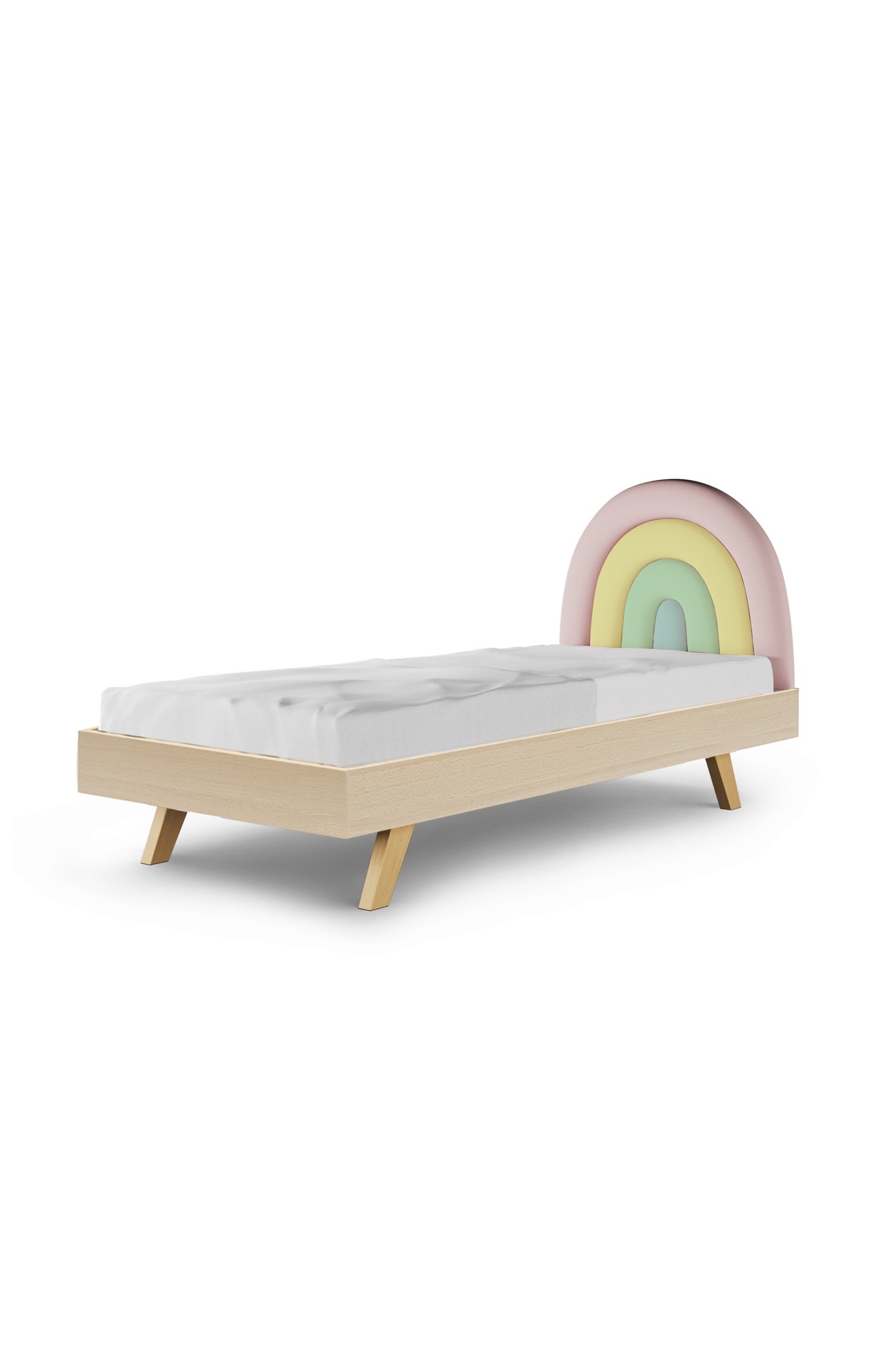 En underbar barnsäng med gavel i form av en vacker regnbåge i en härlig skandinavisk design som ger en härlig känsla till barnrummet.