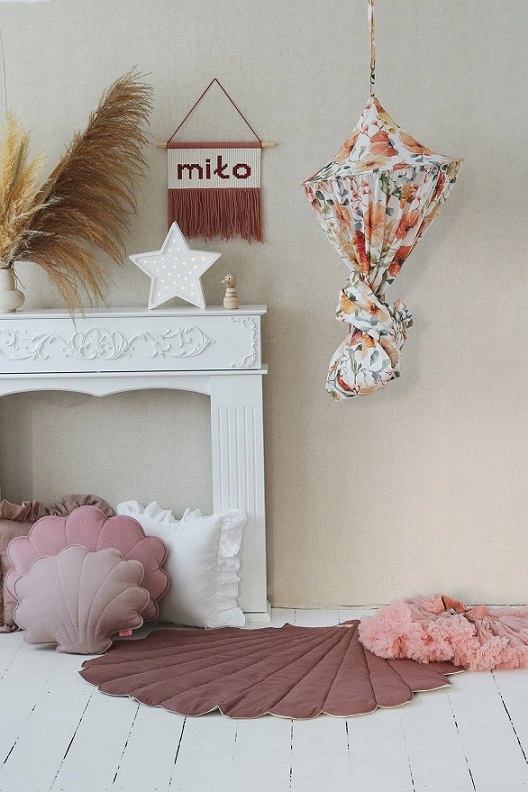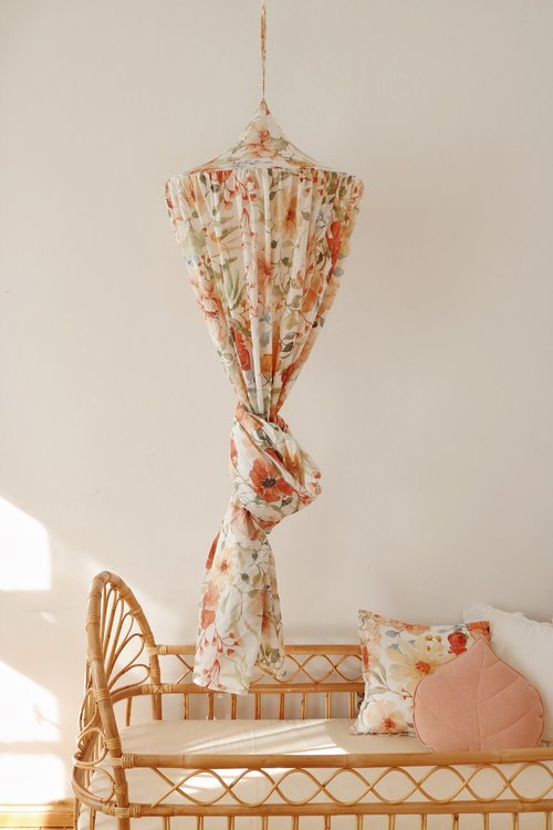 En mycket charmig och vacker blommig sänghimmel tillverkad av högkvalitativt bomull. I varje rum som denna används kommer en sagokänsla att spridas. Perfekt för att inreda barnrummet på ett bra sätt. Sänghimmeln är dessutom förberedd med en praktisk anordning i mitten för att kunna hänga favoritsakerna.