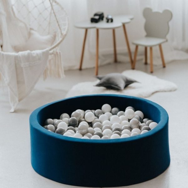 Mörkblå bollhav BASIC, 90×30 med bollar (vit, pearl, grå, silver)