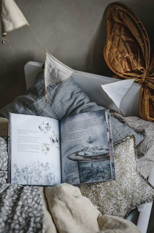 ”?Jag blir rädd, men nyfikenheten tar beslutet åt mig. Med slutna ögon pressar jag lappen hårt mellan händerna. Försiktigt viskar jag landet med det konstiga namnet. Det går en stund och jag vågar knappt andas. Det känns som jag förvandlas till ett glas bubbelvatten. Det luktar plötsligt daggmask, som det gör efter regn, och när jag öppnar ögonen är jag omringad av berg.”