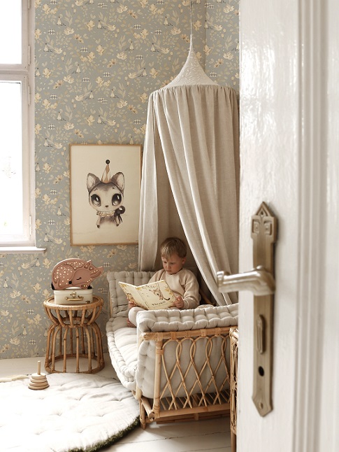 Mrs Mighetto, tapet Forest Flowers, Duvblå