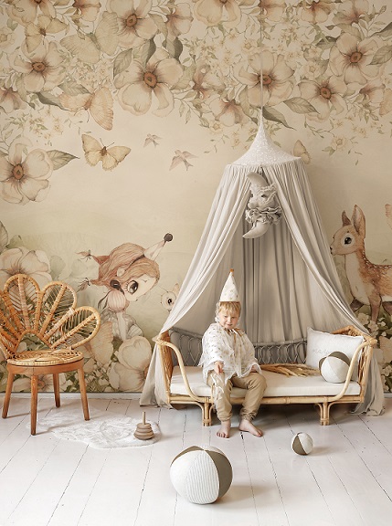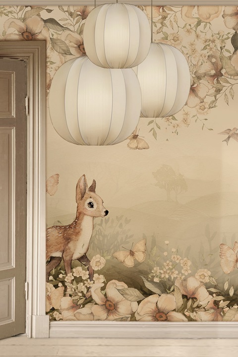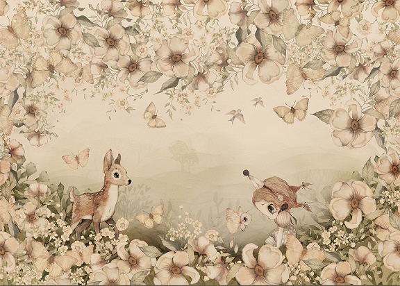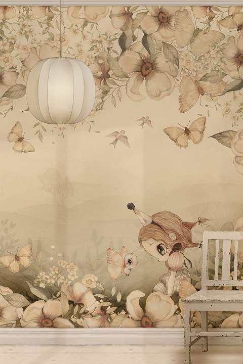 Unik och sagolik mural helt anpassad till din vägg från svenska Mrs Mighetto. Tapeten är som en vacker väggmålning föreställande en skogsglänta med fjärilar, fåglar och sagofigurer från Minimighettos förtrollande värld.