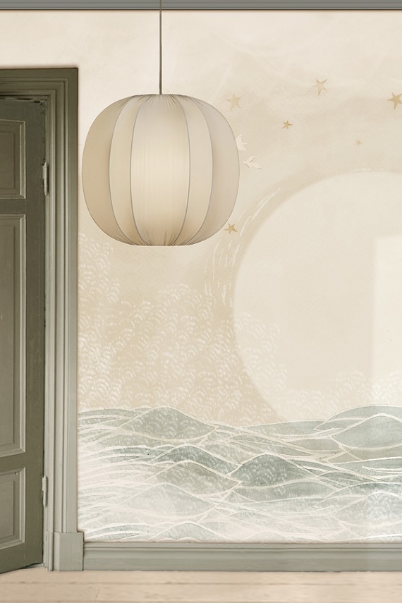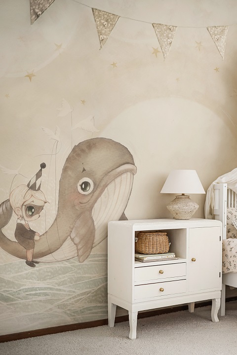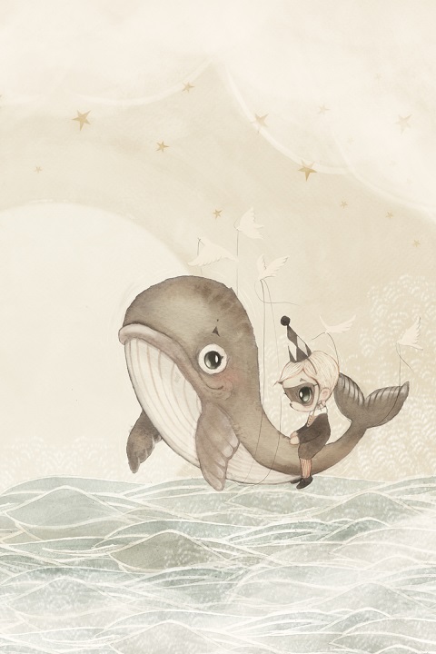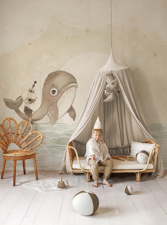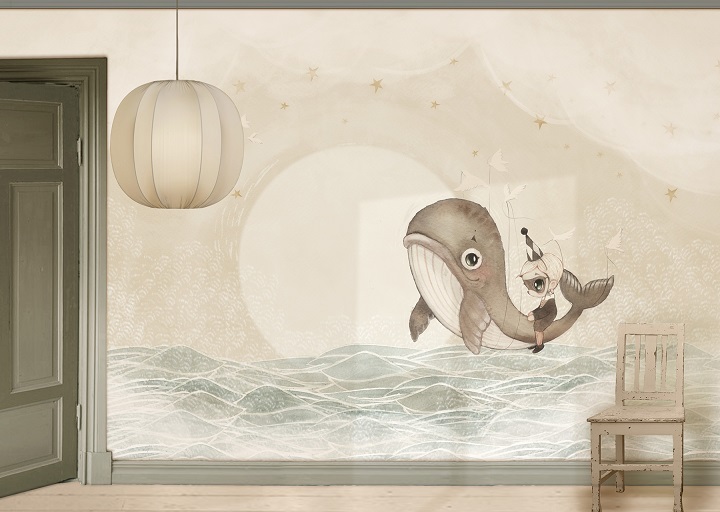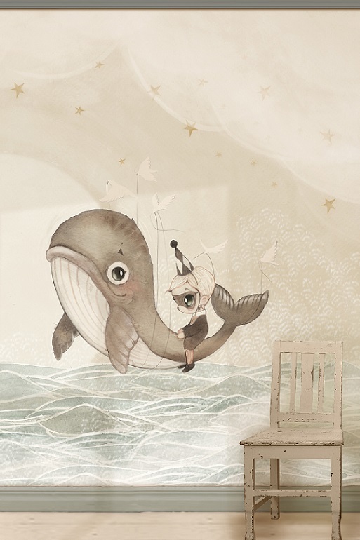 Unik och sagolik mural helt anpassad till din vägg från svenska Mrs Mighetto. Tapeten är som en vacker väggmålning föreställande en val och en pojke från Minimighettos förtrollande värld