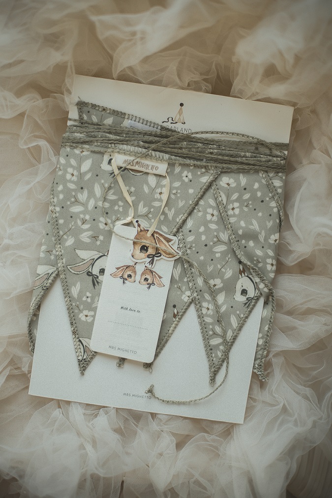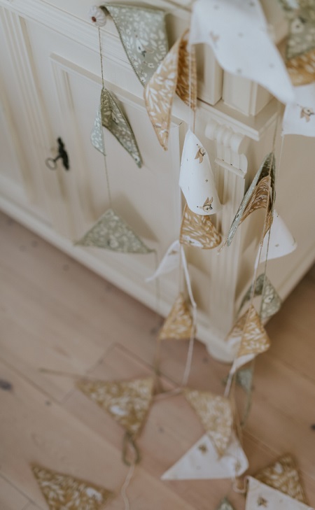 Slingan innehåller totalt 10 stycken dubbelsidiga vimplar av mjuk bomullsatin och är hela 3 meter lång. Denna vimpel passar i barnrummet, eller ute i lekstugan eller varför inte när det är dags för födelsedagsfest.