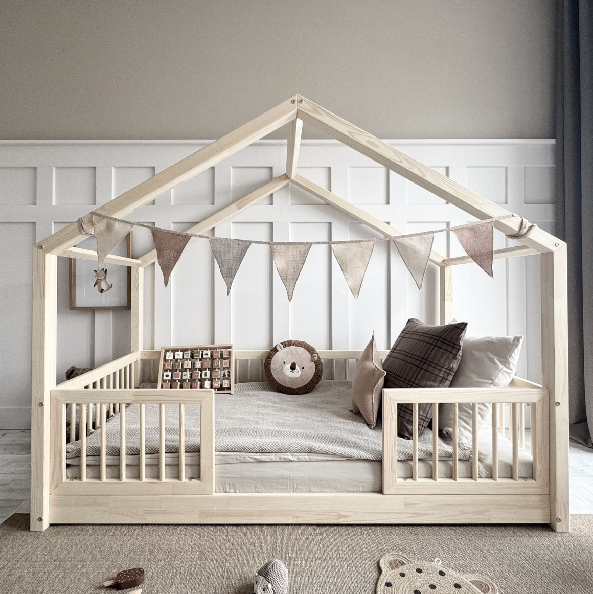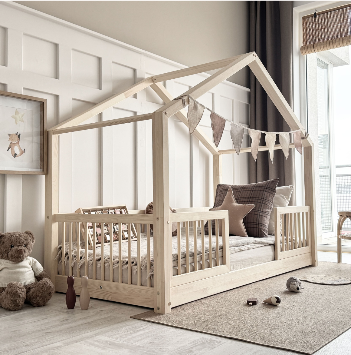 Denna mysiga och stiliga barnsäng i husform är det perfekta valet för att skapa en trygg och inspirerande sovplats för ditt barn. Tillverkad i hållbart limträ, ger sängen ett naturligt och tidlöst utseende som passar in i alla barnrum.