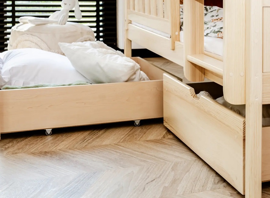På vår fina syskonsäng Betty har man tänkt till ordentligt för att optimera golvytan i barnrummet. Vi lovar att sängen kommer bli dina barns favorit, och inte bara för att sova i då den med enkla medel kan bli en riktigt bra myshörna. Många dekorerar med sänghimlar, vimplar eller ljusslingor, bara din kreativitet sätter stopp.