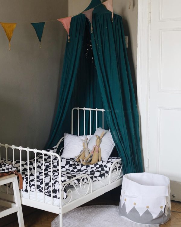 En mycket charmig och vacker sänghimmel i organisk bomull. I varje rum som denna används kommer en sagokänsla att spridas. Perfekt för att inreda barnrummet på ett bra sätt. För att montera sänghimmeln behöver man bara en liten krok som man fäster i taket och sen hänger upp sänghimmeln på den. Sänghimmelns struktur hålls på plats med en metallring som är avtagbar.