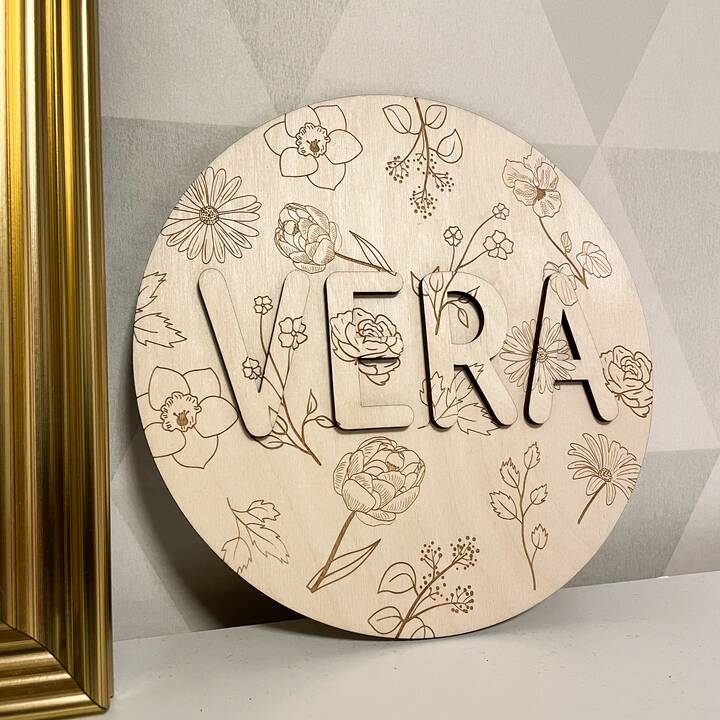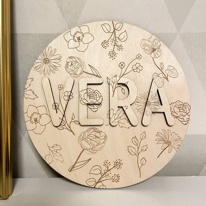 En fin och personlig väggdekoration i form av en söt namnskylt av trä prytt med vackra blomstermotiv. Passar perfekt i barnrummet eller som en dopdekoration. Tillverkas i Sverige och hängs enkelt upp med t.ex. häftmassa eller dubbelhäftande tejp