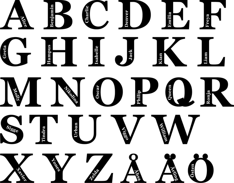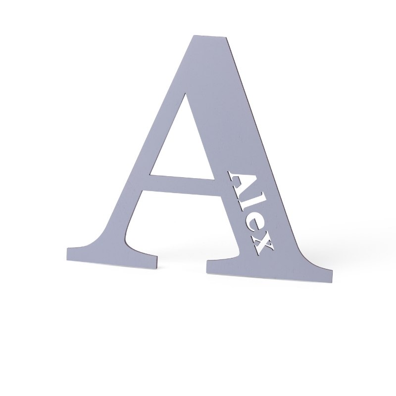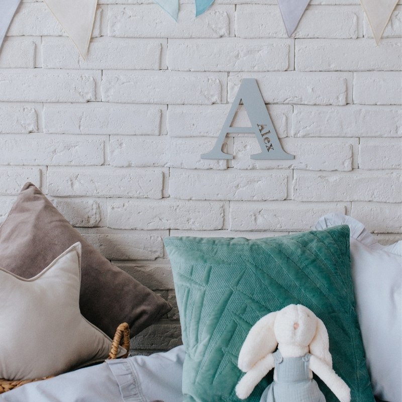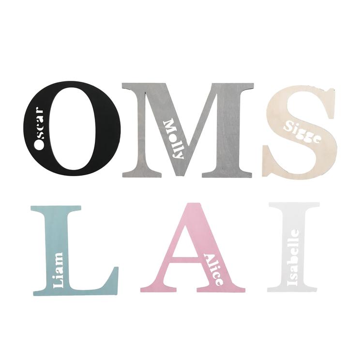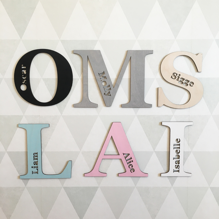 En fin och personlig väggdekoration i form av en bokstav av trä med valfritt namn. Passar perfekt i barnrummet eller som en dopdekoration.