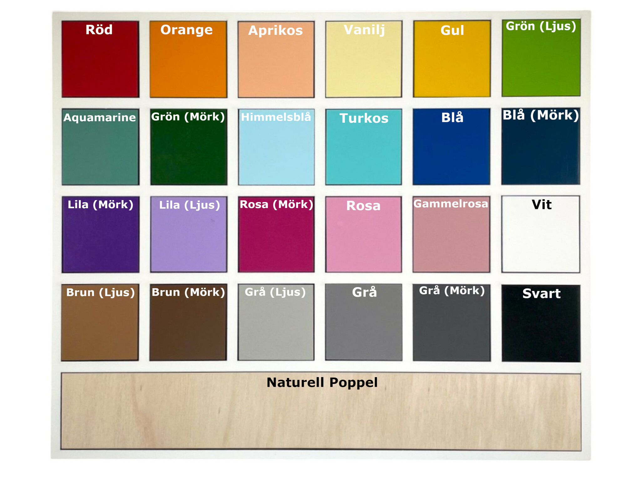 | Färg | rosa, Aprikos, Aquamarine, blå, Blå (mörk), Brun (ljus), Brun (mörk), Gammelrosa, grå, Grå (ljus), Grå (mörk), Grön (ljus), Grön (mörk), Gul, Himmelsblå, Jade, Lila (ljus), Lila (mörk), Naturell Poppel, Orange, Röd, Rosa (mörk), svart, Turkos, Vanilj, vit |