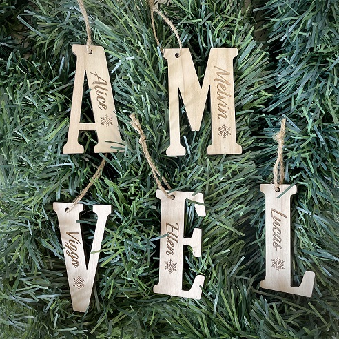 Vackert julhänge i form av en träbokstav med valfritt namn.