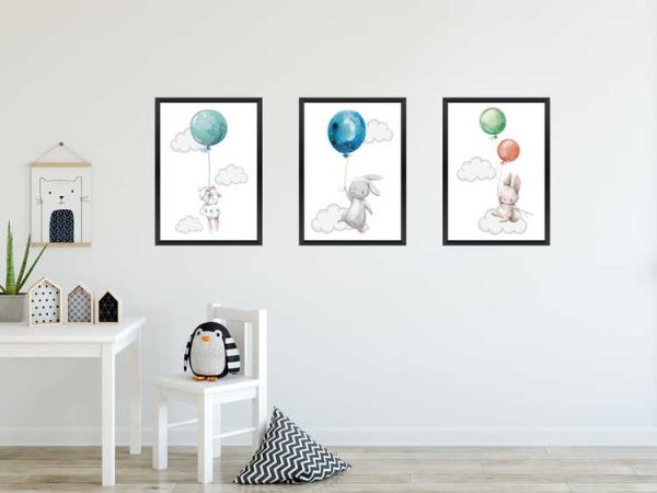 En underbart vackert set av 3 posters för barnrummet med motiv av söta kaniner. Med dessa posters kan du enkelt skapa en unik känsla i din barnrumsinredning och ditt barn kommer att älska de sagoliknande motiven.