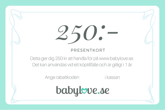 Presentkortet är giltigt i 1 år (datum framgår på presentkortet) och gäller vid ett köptillfälle hos babylove.se