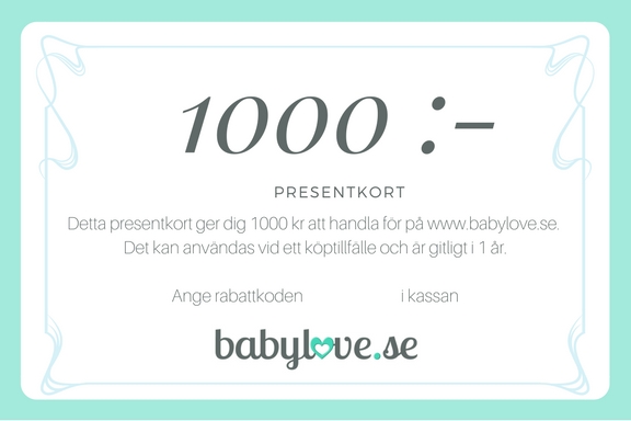 Presentkortet är giltigt i 1 år (datum framgår på presentkortet) och gäller vid ett köptillfälle hos babylove.se