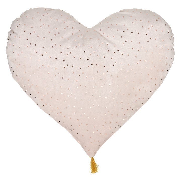 En hjärtformad kudde i vackert tyg med guldiga stjärnor och en tofs!Det vackra utförandet är en sak, men de underbar materialvalen gör det även till en kramfavorit hos barnen. Om du bara ska köpa en inredningsprodukt till barnrummet, är denna den du ska köpa! Mått: 40 x 9 x 45 cm