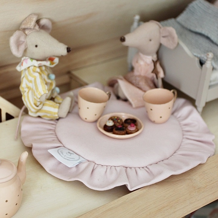 En underbar minimatta med volanger från populära Cotton & Sweets! Mattan är en fin inredningsdetaljer som garanterat kommer att öka mysfaktorn i dockhuset. Passar perfekt till Maileg-kaniner men även andra större dockor. Mått: Diameter cirka 20 cm. Material: 95 % bomull, 5 % elastan.Designer: Cotton & Sweets