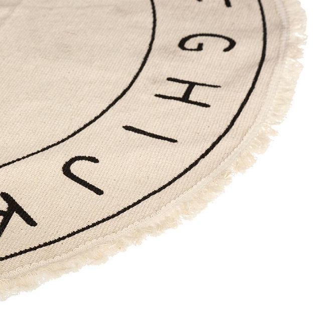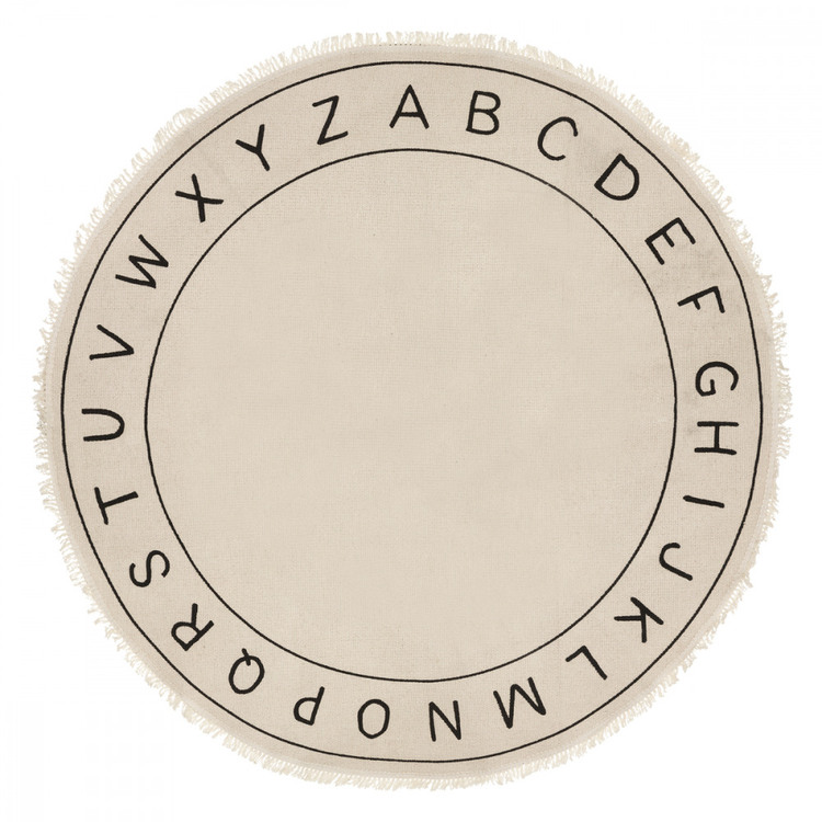 Underbart söt rund alfabetsmatta med fransar. Med små detaljer kan man enkelt skapa en vacker barnrumsinredning i sitt barnrum.