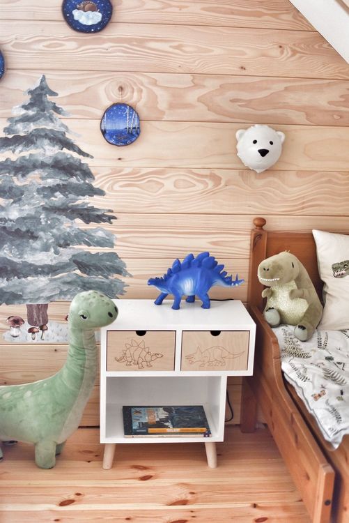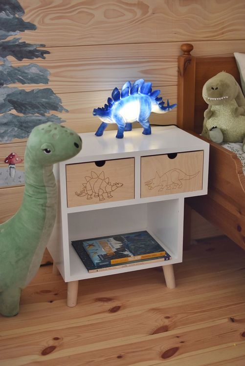 Superfin sängbord i trä till barnrummet. Lådor kan användas till att förvara mindre föremål, leksaker eller bra att ha saker till spädbarnet. Hyllan är perfekt för böcker som ditt barn enkelt kan nå. De två olika nivåerna och de avsmalnande benen, gör att möbeln får ett unikt utseende. Ett komplett sängbord gjort av trä och plywood. Färgen är helt säker för barn. Observera att strukturen på…