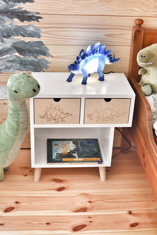 Hyllan är perfekt för böcker som ditt barn enkelt kan nå. De två olika nivåerna och de avsmalnande benen, gör att möbeln får ett unikt utseende. Ett komplett sängbord gjort av trä och plywood.