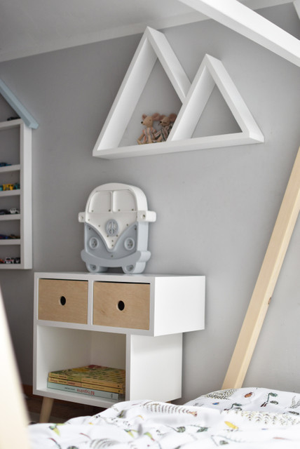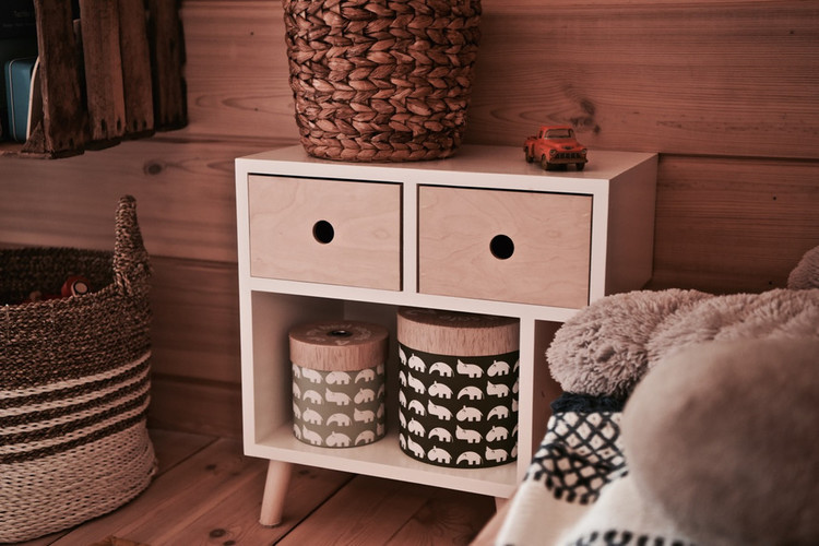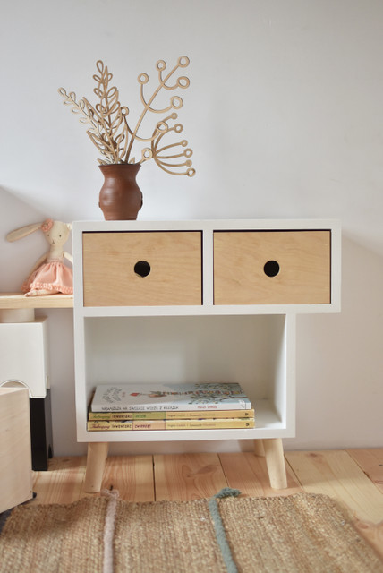 Hyllan är perfekt för böcker som ditt barn enkelt kan nå. De två olika nivåerna och de avsmalnande benen, gör att möbeln får ett unikt utseende. Ett komplett sängbord gjort av trä och plywood.