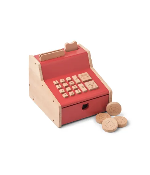 Sänglampan är gjord i bokträ och textilen på lampskärmen är gjord i 100 % bomull.