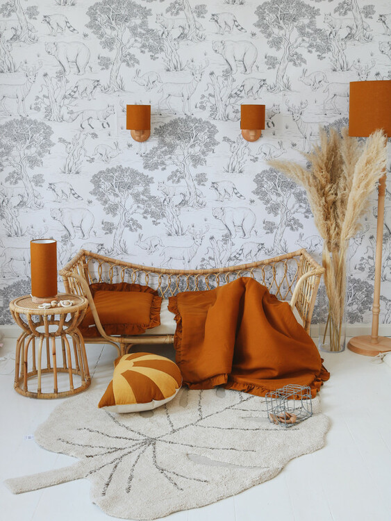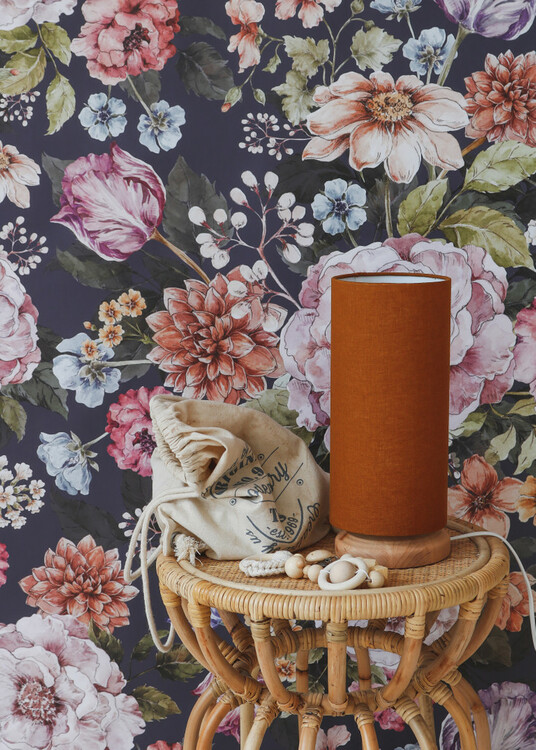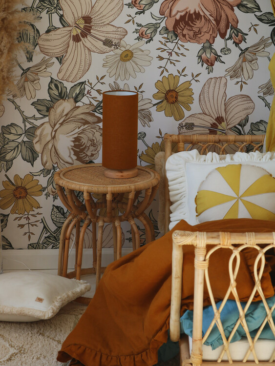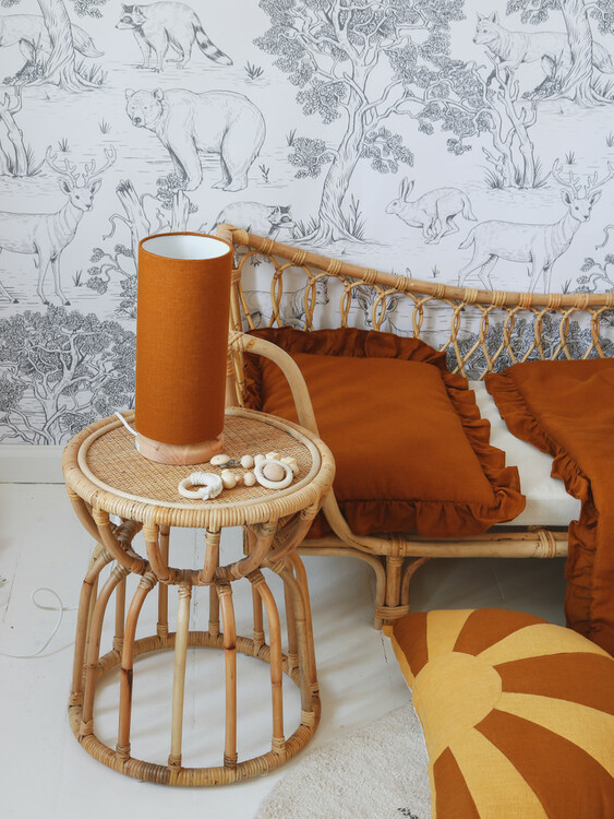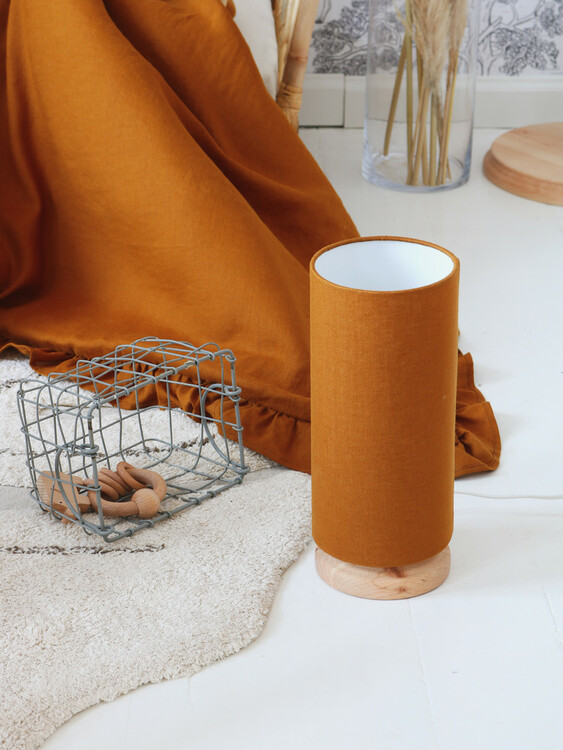Sänglampan är gjord i bokträ och textilen på lampskärmen är gjord i 100 % linne.