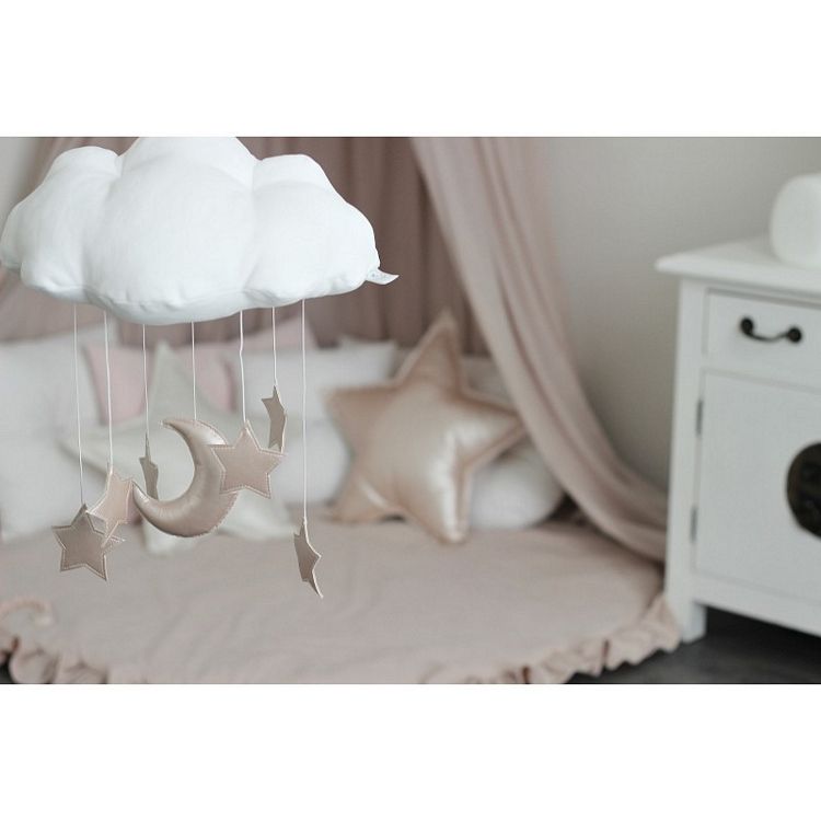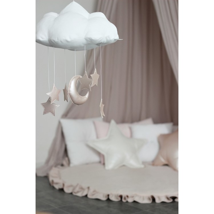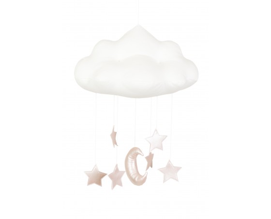 Alla barn älskar denna vackra och dekorativa mobil av fina moln. Tillverkad av mjuk bomullssammet med skimrande stjärnor och en måne. Charmig i sin enkelhet och idealisk för barnrumsinredningen. Mått: Bredd 26 cm, längd 37 cm och höjd 44 cm. Material: 100 % bomull och eko-läder. Fylllning: polyesterbollar.Designer: Cotton & Sweets