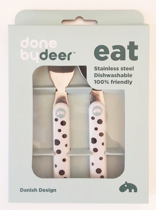Praktiska bestick fulla av ”happy dots” och perfekta hjälpmedel för att lära barnet att äta själv. Besticken är såväl säkra för barnets fingrar som tålig för tvätt i diskmaskinen. Material: Rostfritt stål med ABS handtag. Använd ej i mikrovågsugnen. Storlek: 14 cm.Designer: Done by deer