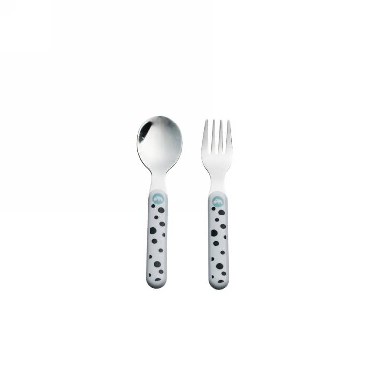 Praktiska bestick fulla av ”happy dots” och perfekta hjälpmedel för att lära barnet att äta själv.