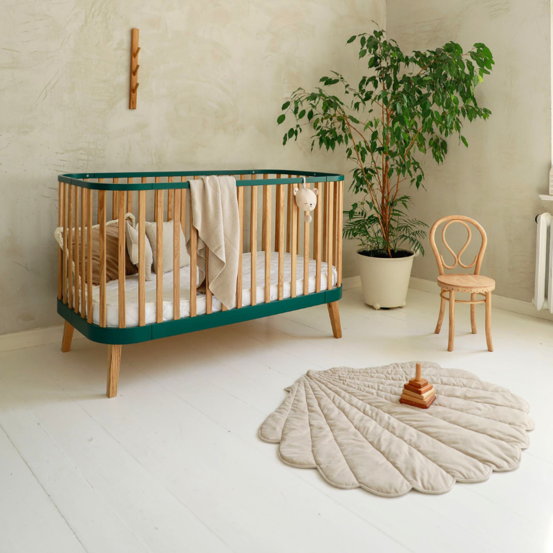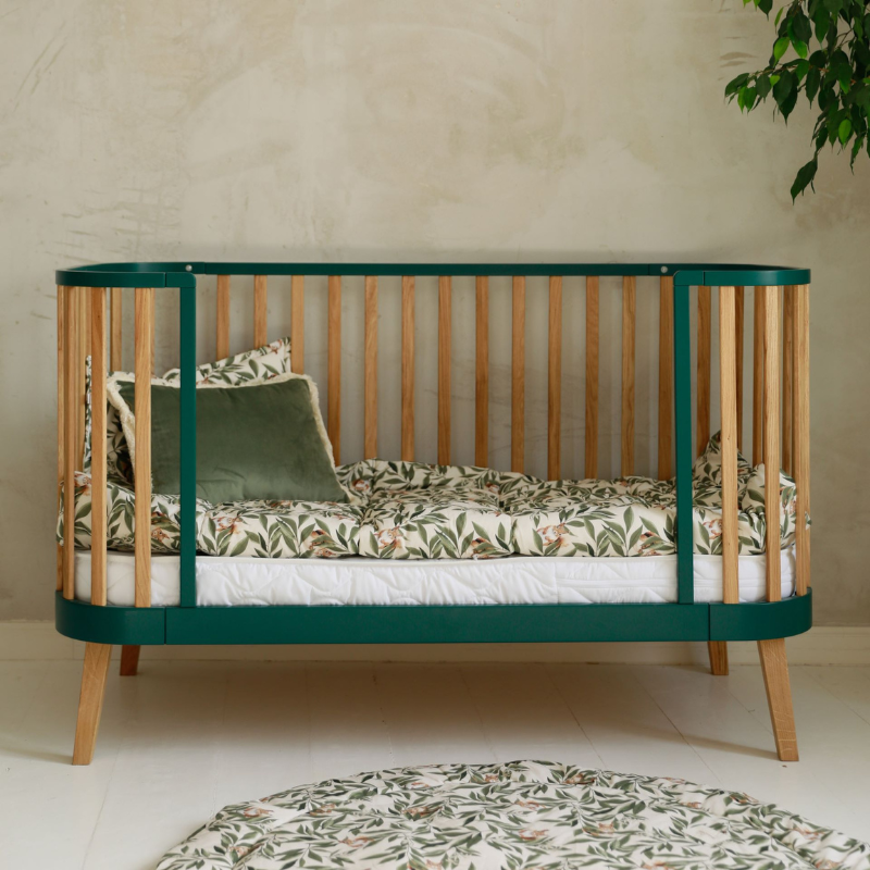 -Spjälsängens sarg och ben är gjorda i ek, medan de övriga delarna är tillverkade i bokträ.