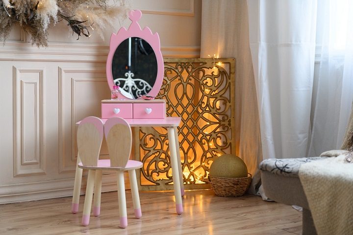 Möblerna ger en fantastisk charm till barnrummet, men fyller givetvis även ett praktiskt syfte. Perfekt när det är dags att styla håret eller sminka sig. Kan också användas som arbetsbord för läxläsning och pyssel. Spegelbordet har två lådor med söta knoppar där ditt barn kan förvara smycken, smink eller pennor.