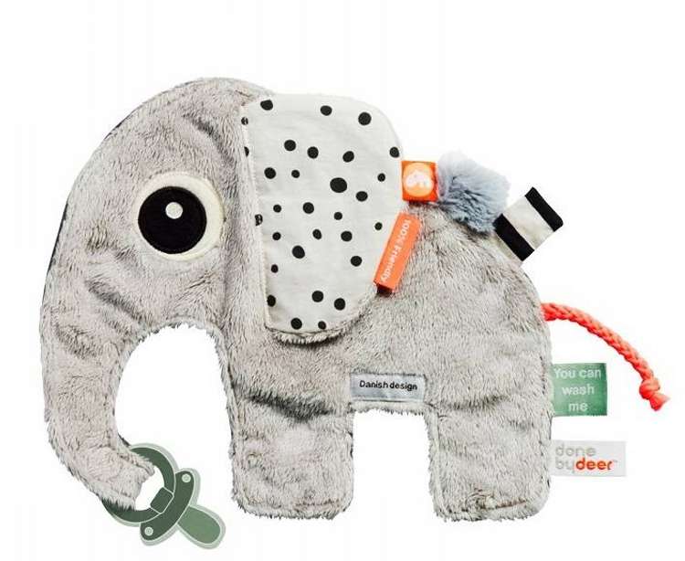 Din bebis bästa vän!Elefanten Elphee som snuttefilt med napphållare och detaljer som barnet kan utforska. Elphee är en trygghet för barnet både i vaggan och i vagnen.Material: Bomull och polyester.Tvättråd: Tvättas i 40 grader, torktumlas ej.Mått: 25×22 cm.