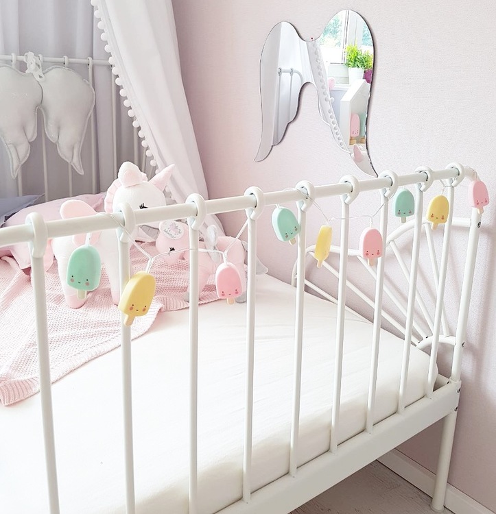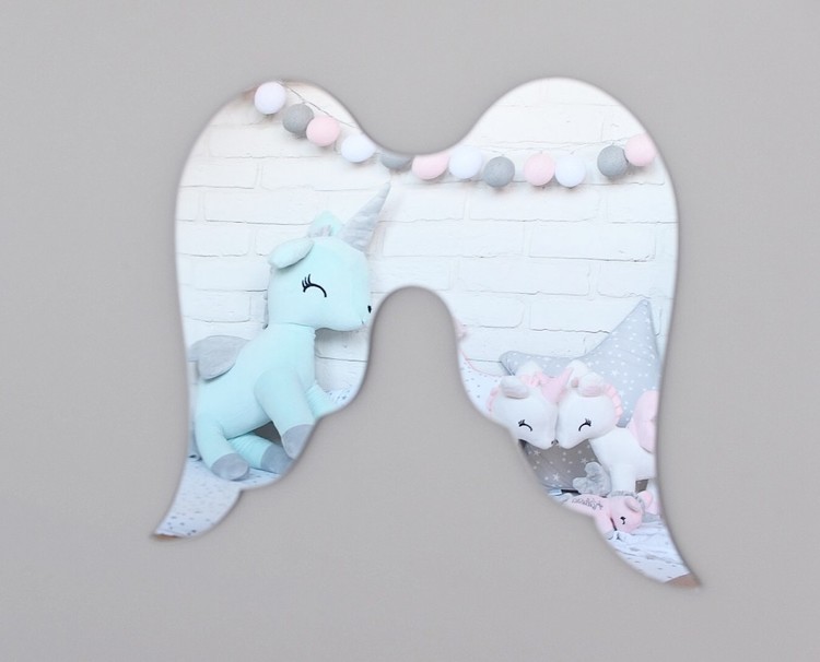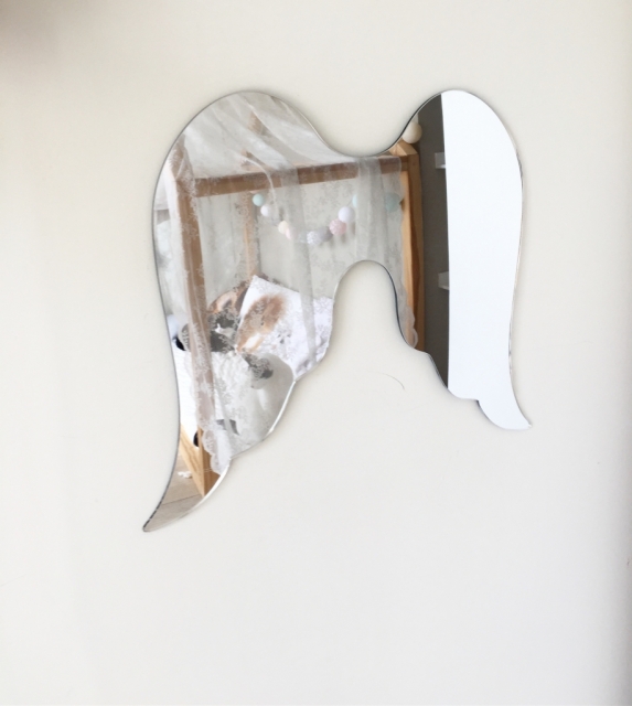 Superfin barnspegel i form av änglavingar. En fantastisk dekoration till barnrummet och en fin inredningsdetalj. Enkel att hänga upp på väggen med hjälp av metallkroken.