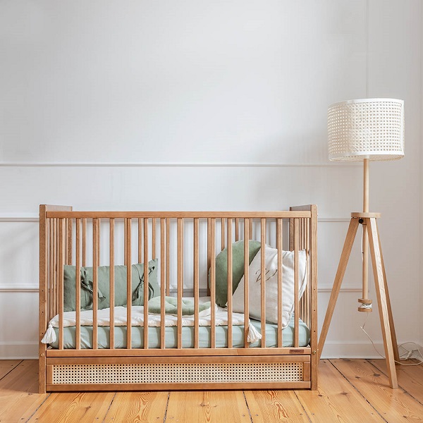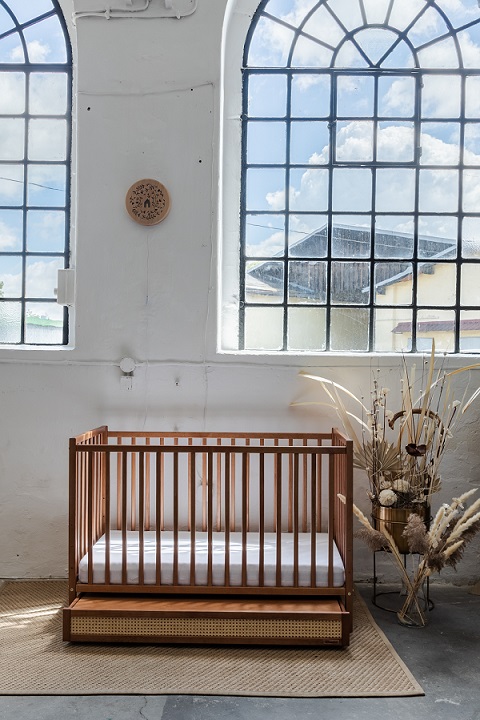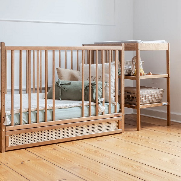 Den här fina spjälsängen kan anpassas efter barnets utvecklingsfaser, bland annat genom fyra nivåer på sängbotten. När barnet är stort nog att kliva i och ur sängen själv, så kan man även ta bort tre spjälor. Unikt och praktiskt!