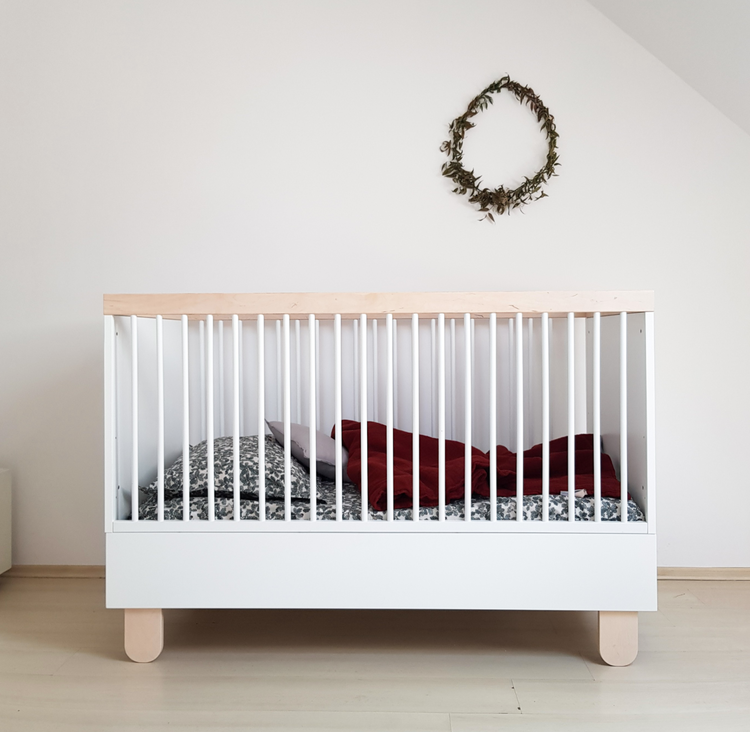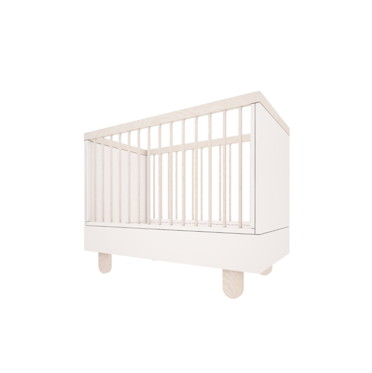 Handgjord och unik ”2 in 1” spjälsäng och juniorsäng i fin vit/natur färg. Sängens material är björkplywood som är tillverkat enligt en så kallad EN71 / 3 – standard, som är ett kvalitetscertifikat för barnmöbler och leksaker. Akrylfärgerna som används är även de certifierade enligt EN71 / 3 – standard.Botten kan justeras i tre olika lägen för babyn och sängen är förberedd för att göras om…