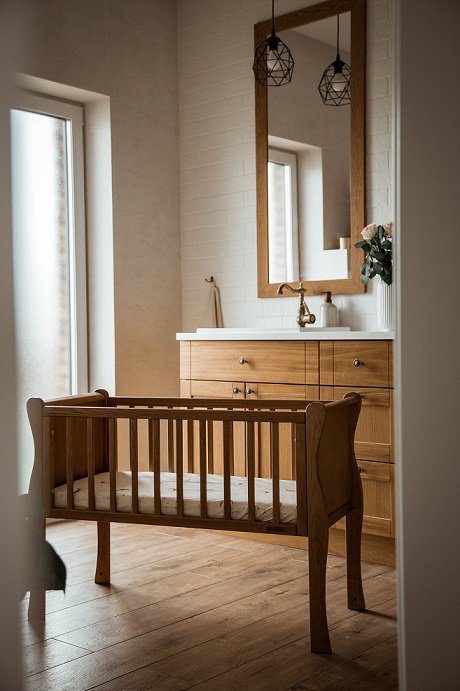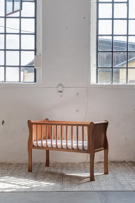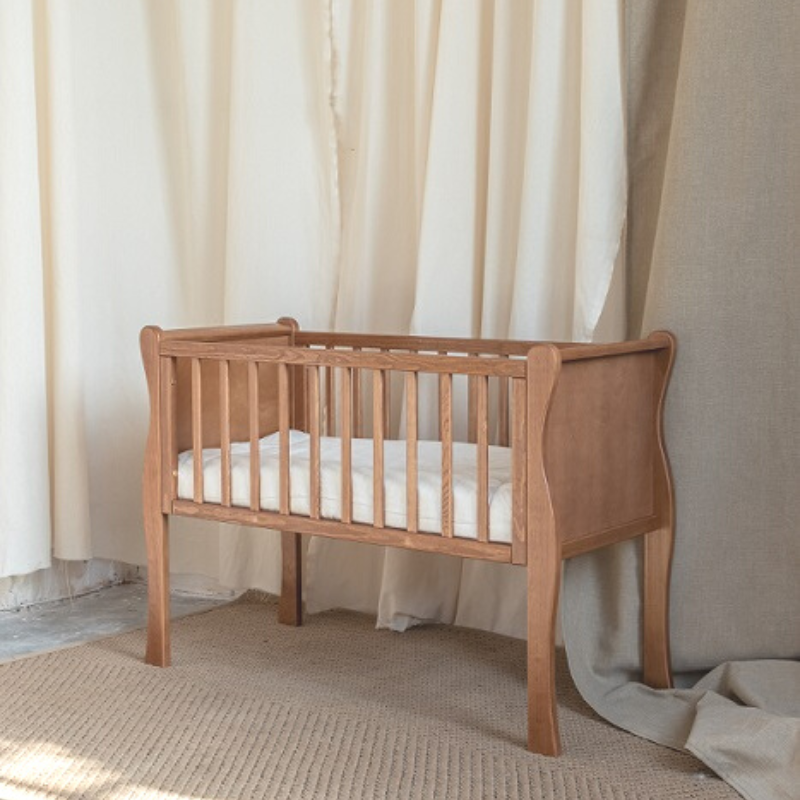 Underbar valnötsfärgad spädbarnssäng i romantisk retrostil som är perfekt som bebisens första säng!