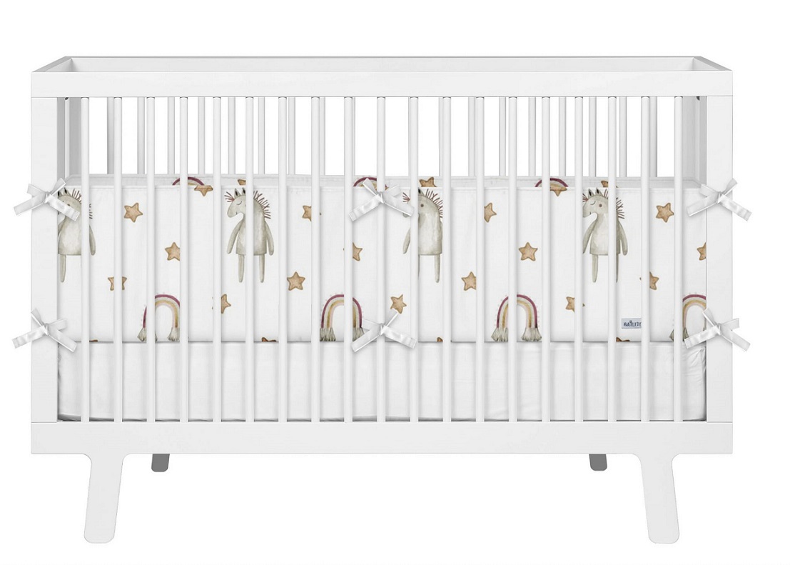 Fästs med söta knytband och är lämpligt för vaggor, spjälsängar och barnsängar med stödbräda med ribbor.