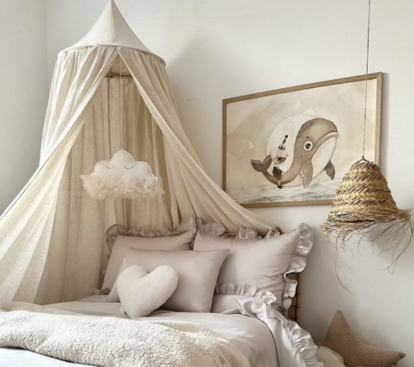 En mycket charmig och vacker natur sänghimmel tillverkad av en blandning av högkvalitativ muslinbomull och linne. Designad i en enkel form och i en typisk skandinavisk stil. I varje rum som denna används kommer en sagokänsla att spridas. Perfekt för att inreda barnrummet på ett bra sätt. Sänghimmeln är dessutom förberedd med en praktisk anordning i mitten för att kunna hänga favoritsakerna.