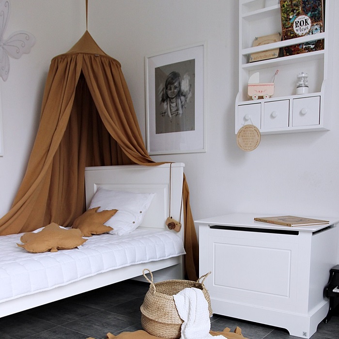 En mycket charmig och vacker senapsgul sänghimmel tillverkad av högkvalitativt linne. Designad i en enkel form och i en typisk skandinavisk stil. I varje rum som denna används kommer en sagokänsla att spridas. Perfekt för att inreda barnrummet på ett bra sätt. Sänghimmeln är dessutom förberedd med en praktisk anordning i mitten för att kunna hänga favoritsakerna.