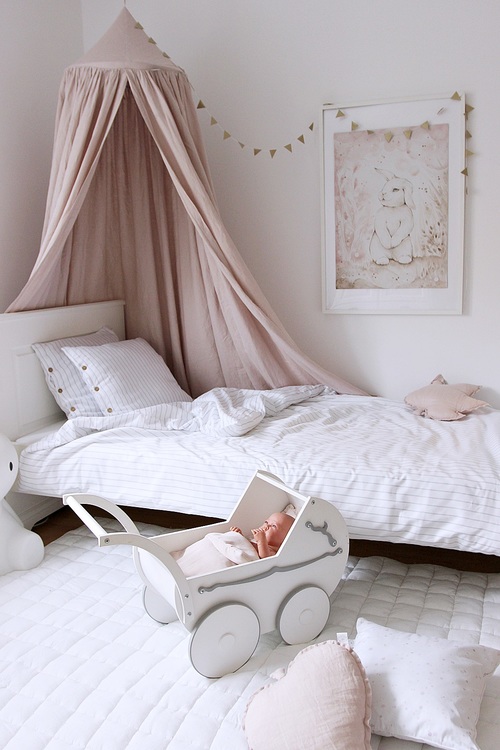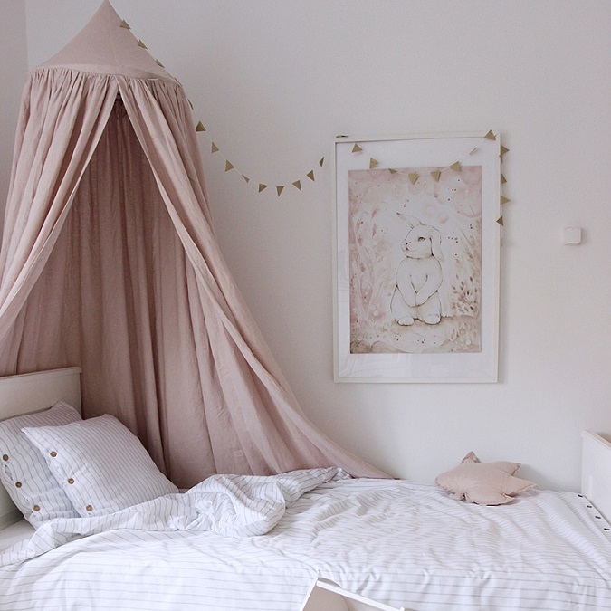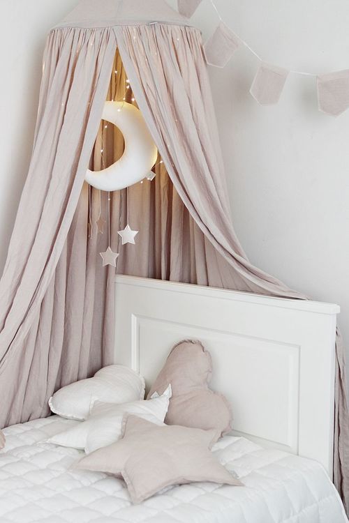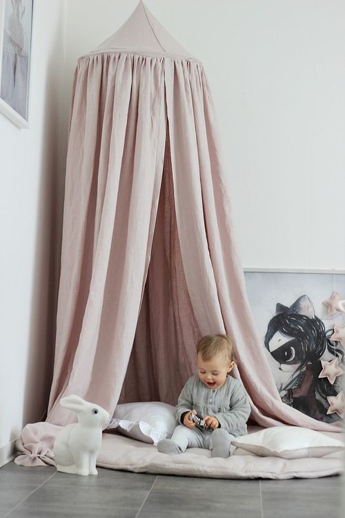 En mycket charmig och vacker puderrosa sänghimmel tillverkad av högkvalitativt linne ! Detta är en storsäljare!  Designad i en enkel form och i en typisk skandinavisk stil. I varje rum som denna används kommer en sagokänsla att spridas. Perfekt för att inreda barnrummet på ett bra sätt. Sänghimmeln är dessutom förberedd med en praktisk anordning i mitten för att kunna hänga favoritsakerna.