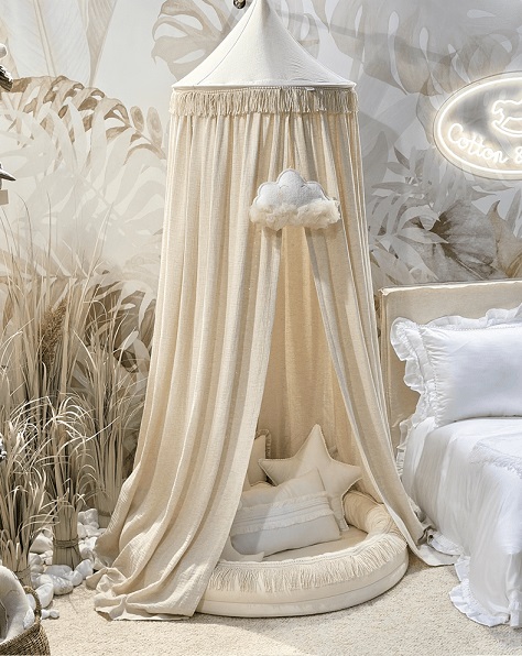 En mycket charmig och vacker natur sänghimmel tillverkad av högkvalitativ bomull och linnemuslin . Designad i en enkel form och i en typisk skandinavisk stil. I varje rum som denna används kommer en sagokänsla att spridas. Perfekt för att inreda barnrummet på ett bra sätt. Sänghimmeln är dessutom förberedd med en praktisk anordning i mitten för att kunna hänga favoritsakerna.