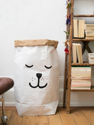 Tellkiddo papperspåse sovande björn Denna fina förvaringspåse är helt gjord i papper och unik i sitt slag. Ett roligt och annorlunda alternativ till din övriga förvaring. Du kan enkelt förvara leksaker, kuddar eller överkastet till sängen. Eller varför inte använda den som tvättsäck? Förutom att den är praktisk är det även en fin detalj i din barnrumsinredning. Produkten är helt…