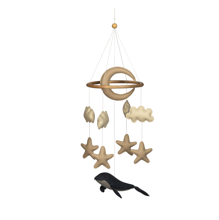 En fantastisk fin och helt handgjord sängmobil för de allra minsta i hemmet. Skapa din egna och unika miljö i barnrummet med hjälp av de små mjuka stjärnor som tillsammans med molnen och valen flyter långsamt i luften.