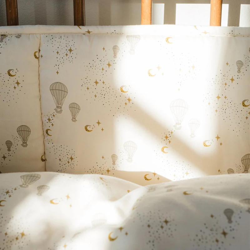Ett mycket vackert och högkvalitativt spjälskydd i en vacker golden beige färg. Tillverkad i 100% organisk bomull.
