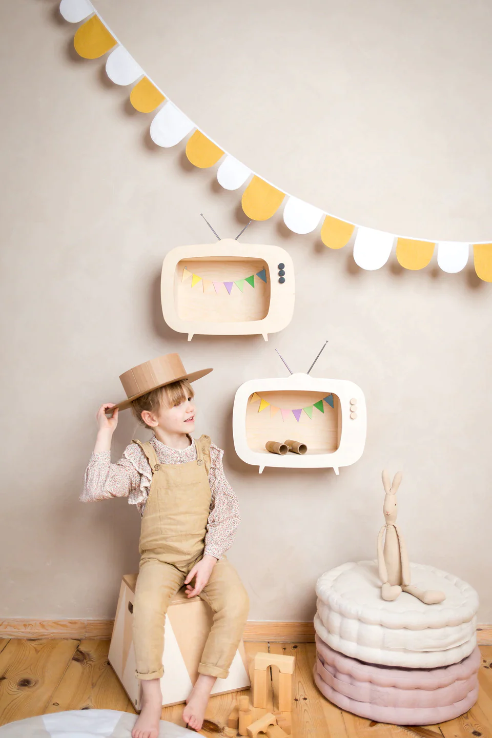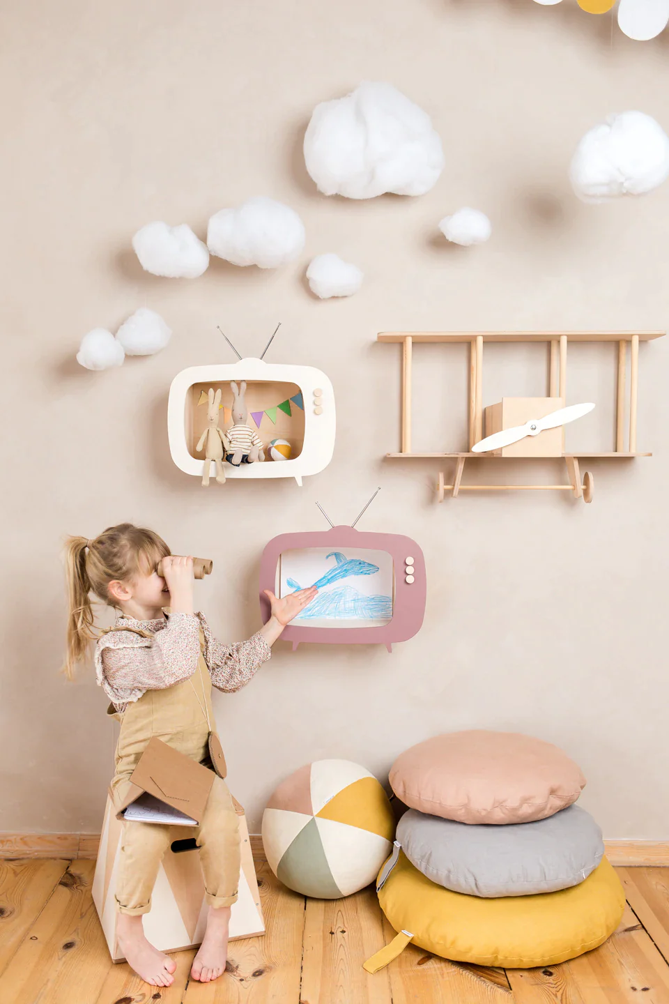 Vem vill inte ha en egen TV? Och då vi menar vi verkligen en egen där ditt barn gör sina egna filmer eller skapar sin egen show. Huvudrollen kanske teddybjörnen har, medan andra leksaker och dockor har sina roller. Barnet kan även rita något som händer och visa i denna. Antennen är på plats för att alltid ge en bra signal. Med denna vägghylla låter vi ditt barns kreatvitet flöda på ett roligt och fint sätt, en given succé.